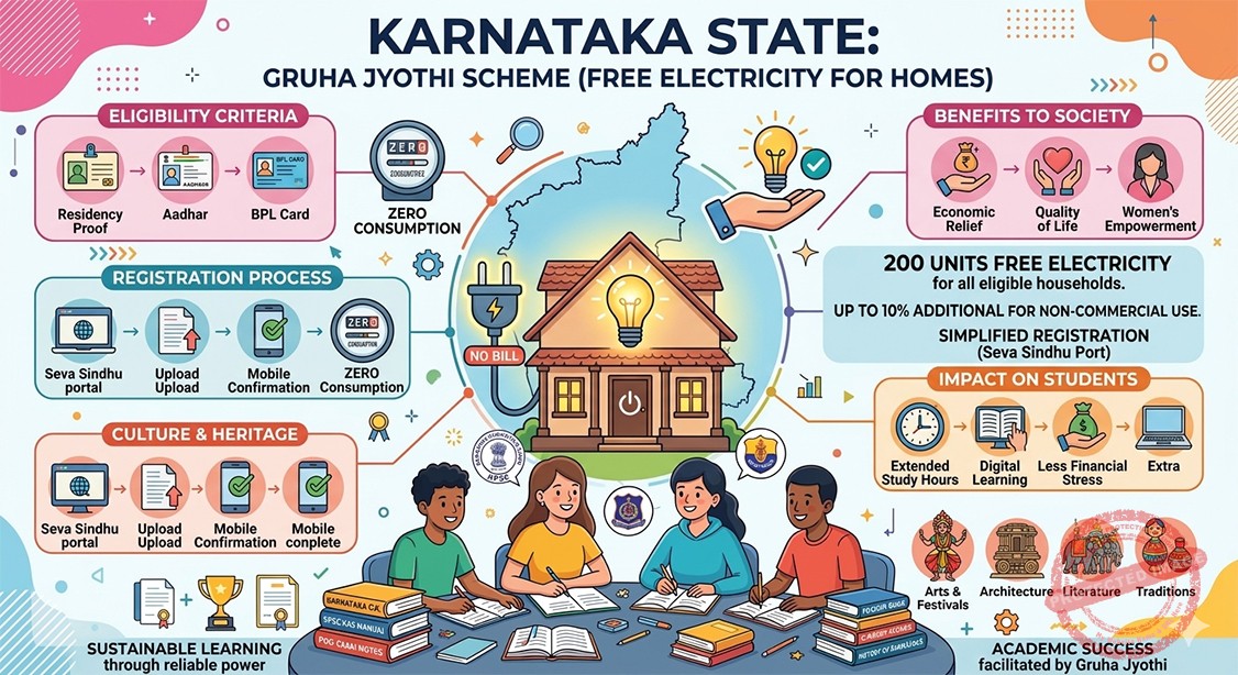 ಗೃಹ ಜ್ಯೋತಿ ಯೋಜನೆ ಕರ್ನಾಟಕ ಸರ್ಕಾರದ ಪ್ರಮುಖ ಕಲ್ಯಾಣ ಯೋಜನೆಗಳಲ್ಲಿ ಒಂದಾಗಿದೆ. ಇದರ ಮೂಲಕ ಜನರಿಗೆ 200 ಯುನಿಟ್‌ಗಳವರೆಗೆ ಉಚಿತ ವಿದ್ಯುತ್ ಒದಗಿಸಲಾಗುತ್ತದೆ. ಈ ಯೋಜನೆಯ ಮುಖ್ಯ ಉದ್ದೇಶ ಜನರ ವಿದ್ಯುತ್ ವೆಚ್ಚವನ್ನು ಕಡಿಮೆ ಮಾಡುವುದು ಮತ್ತು ಅವರ ಜೀವನಮಟ್ಟವನ್ನು ಸುಧಾರಿಸುವುದು. ಸ್ಪರ್ಧಾತ್ಮಕ ಪರೀಕ್ಷೆಗಳಿಗೆ ತಯಾರಿ ಮಾಡುವ ವಿದ್ಯಾರ್ಥಿಗಳು ಈ ಯೋಜನೆಯ ಉದ್ದೇಶ, ಪ್ರಯೋಜನಗಳು ಮತ್ತು ಪ್ರಮುಖ ಅಂಶಗಳನ್ನು ತಿಳಿದುಕೊಳ್ಳುವುದು ಅತ್ಯಂತ ಮುಖ್ಯ.