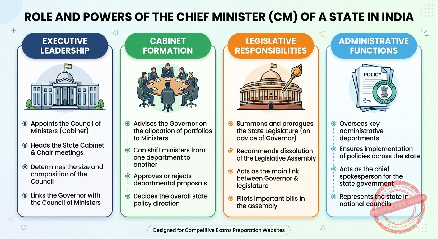 • ಮುಖ್ಯಮಂತ್ರಿಯ ಪ್ರಮುಖ ಅಧಿಕಾರಗಳು – ಕಾರ್ಯನಿರ್ವಹಣಾ, ಶಾಸನಾತ್ಮಕ ಮತ್ತು ಆಡಳಿತಾತ್ಮಕ ಅಧಿಕಾರಗಳು.